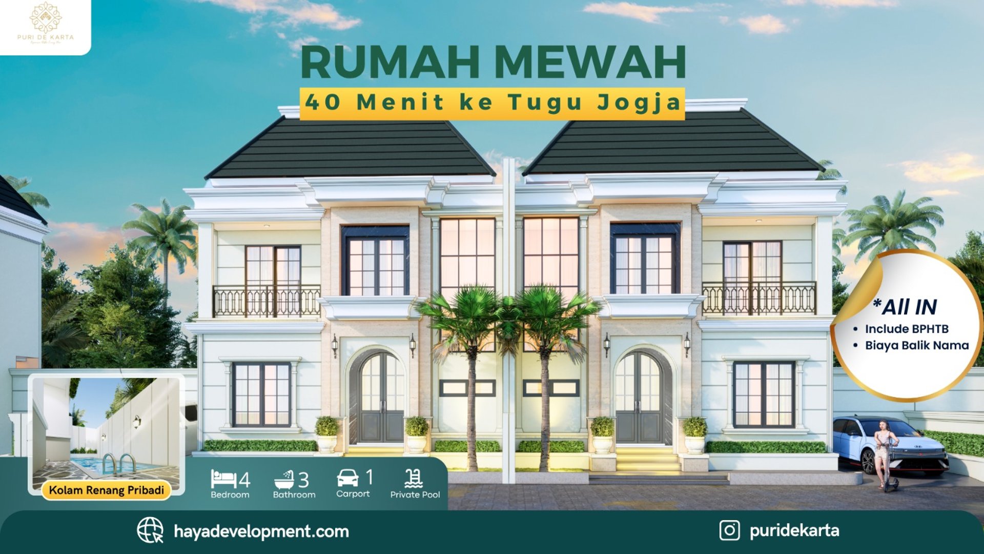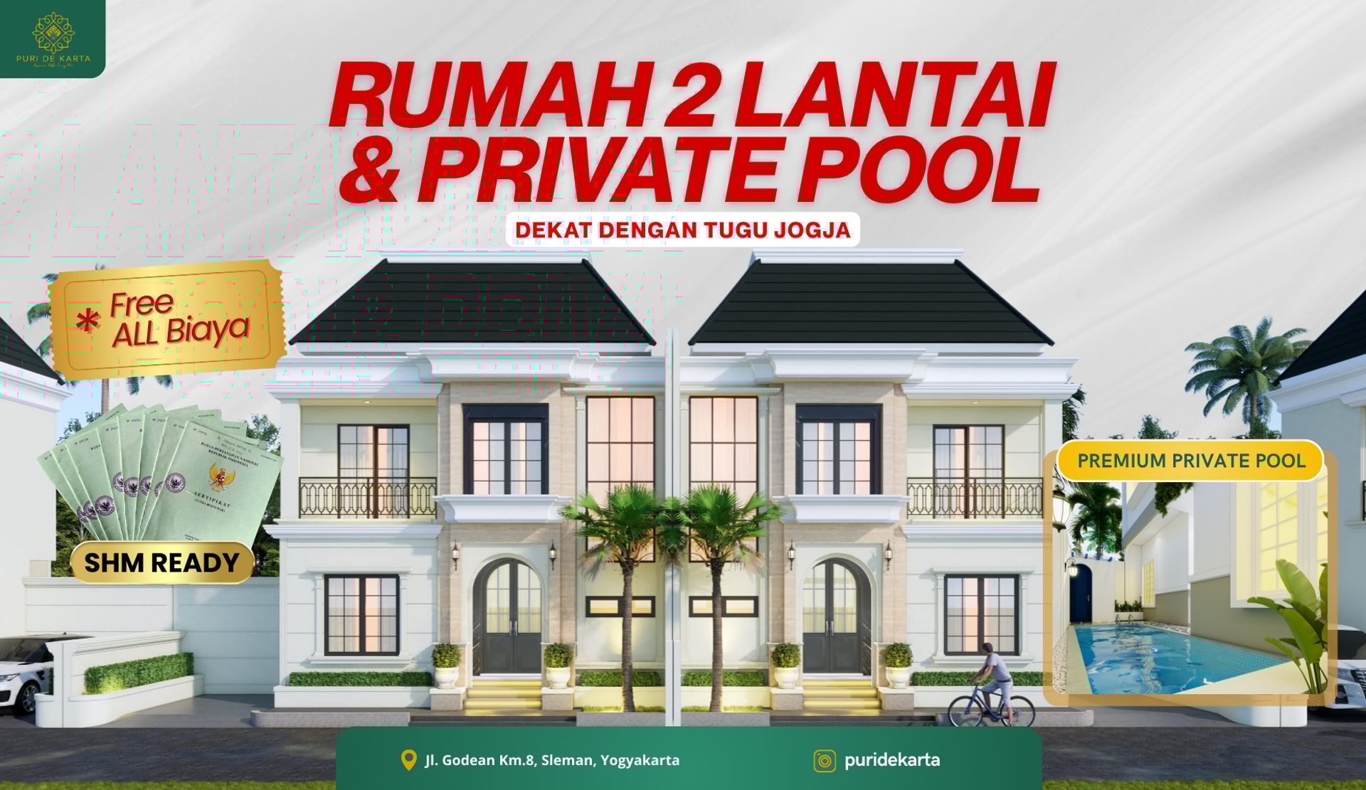 Hunian eksklusif dengan fasilitas lengkap kini semakin mudah. Puri De Karta Godean menghadirkan rumah 2 lantai dengan desain American Classic, dilengkapi 4 kamar tidur, 3 kamar mandi, carport, ruang hingga private pool.